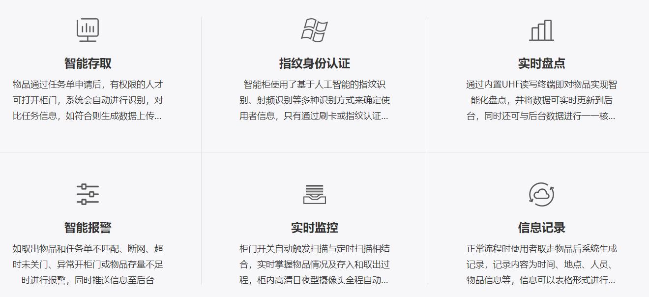RFID智能柜是通过RFID物联网技术,对每个所需管理的工具镶嵌RFID电子标签进行身份识别,柜子内部为RFID监测系统实时监测柜子内的物品信息。